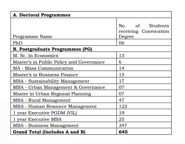 ଡକ୍ଟରାଲ୍ ଏବଂ ସ୍ନାତକୋତ୍ତର କାର୍ଯ୍ୟକ୍ରମ ପାଇଁ ଡିଗ୍ରୀ ଗ୍ରହଣ କରୁଥିବା ଛାତ୍ର ସଂଖ୍ୟା ଯଥାକ୍ରମେ ୦୬ ଏବଂ ୬୩୯ | ବିଭିନ୍ନ କାର୍ଯ୍ୟକ୍ରମ ପାଇଁ ଡିଗ୍ରୀ ହାସଲ କରିଥିବା ଛାତ୍ରମାନଙ୍କ ସଂଖ୍ୟାର ବିସ୍ତୃତ ବିବରଣୀ ନିମ୍ନରେ ଉଲ୍ଲେଖ କରାଯାଇଛି :