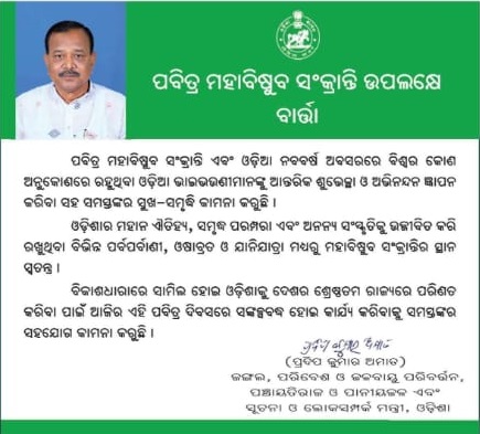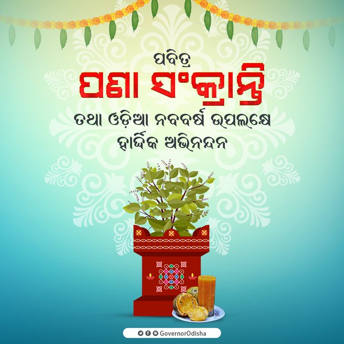 ପବିତ୍ର ପଣା ସଂକ୍ରାନ୍ତି ଓଡ଼ିଶାର ପୁରପଲ୍ଲୀରେ ହର୍ଷୋଲ୍ଲାସରେ ପାଳିତ ହେଉଅଛି । ଏ ଅବସରରେ ପଣାପାଣିର ଆସର ସାଙ୍ଗକୁ ବିଭିନ୍ନ ସାରସ୍ୱତ ସଭାସମିତି ମଧ୍ୟ ଆୟୋଜିତ ହେଉଅଛି । ଏହି ଓଡ଼ିଆ ନବବର୍ଷ ଉପଲକ୍ଷେ ଓଡ଼ିଶାର ପ୍ରିୟ ଭାଇଭଉଣୀମାନଙ୍କୁ ମୋର ଆନ୍ତରିକ ଶୁଭେଚ୍ଛା ଜଣାଉଛି ଏବଂ ସୁଖସମୃଦ୍ଧି କାମନା କରୁଅଛି ।
